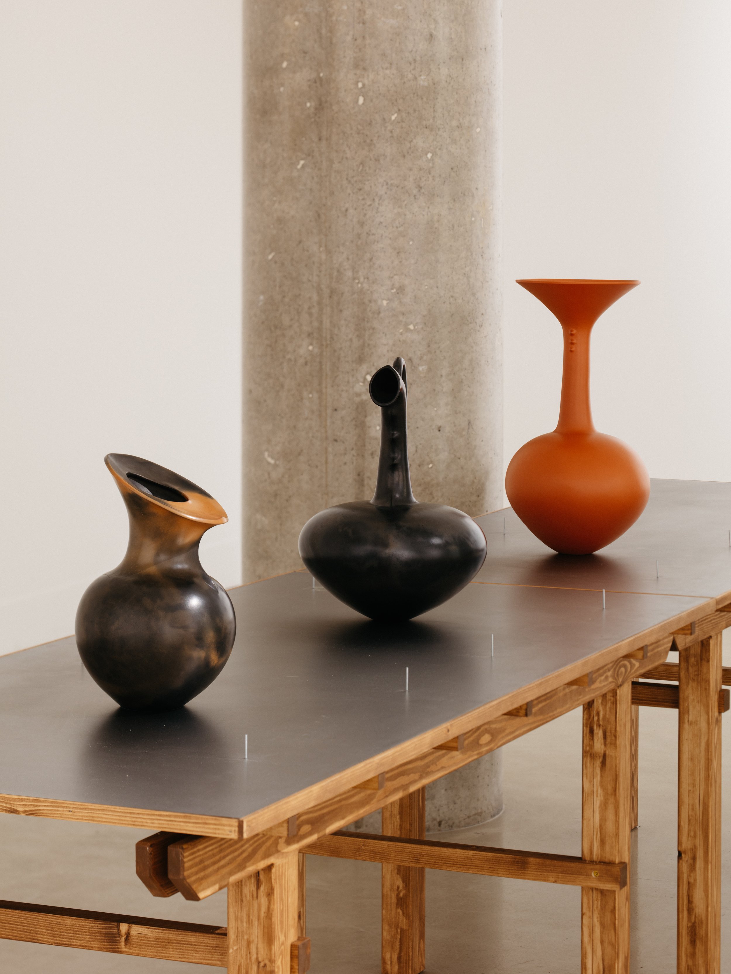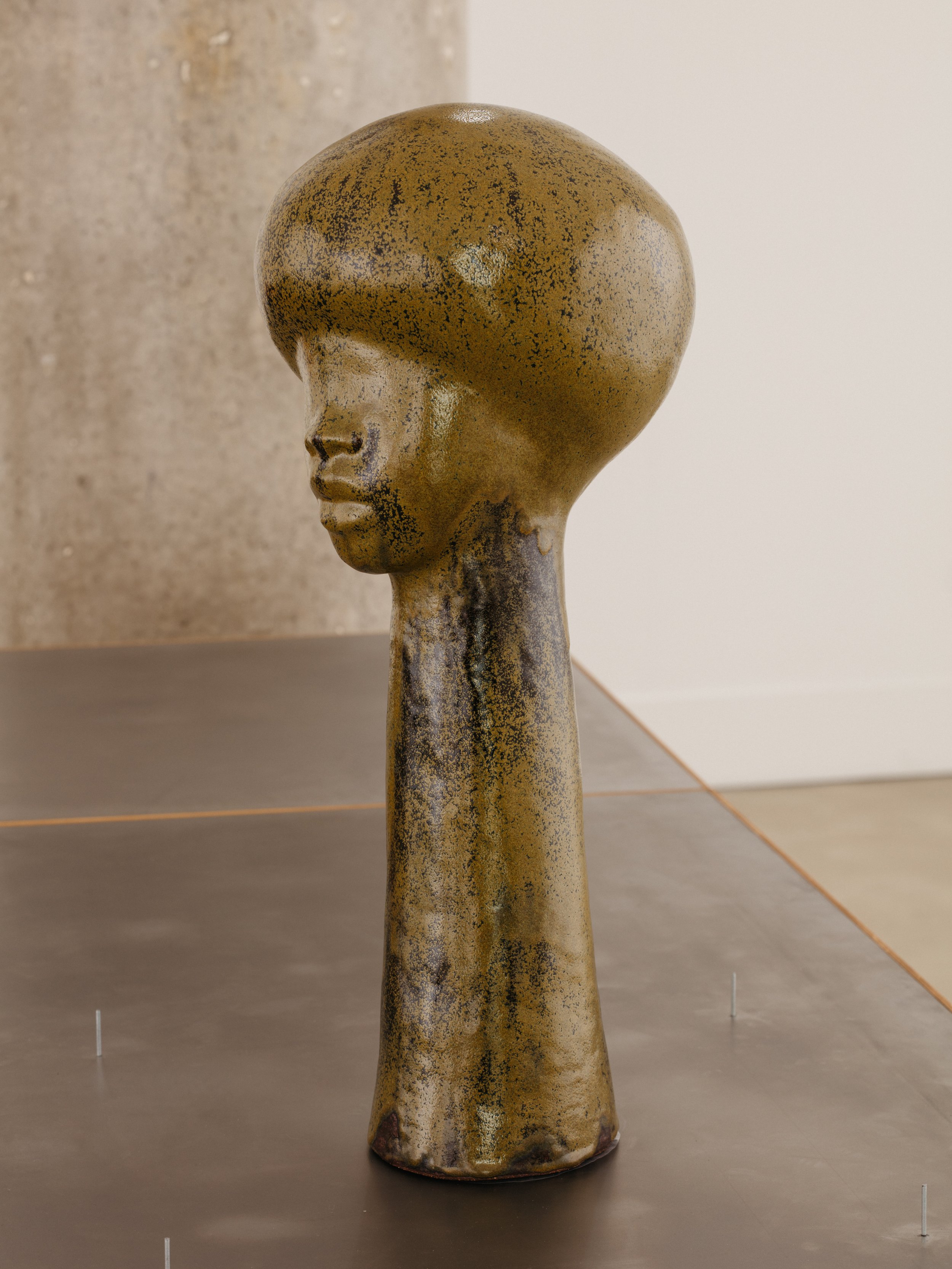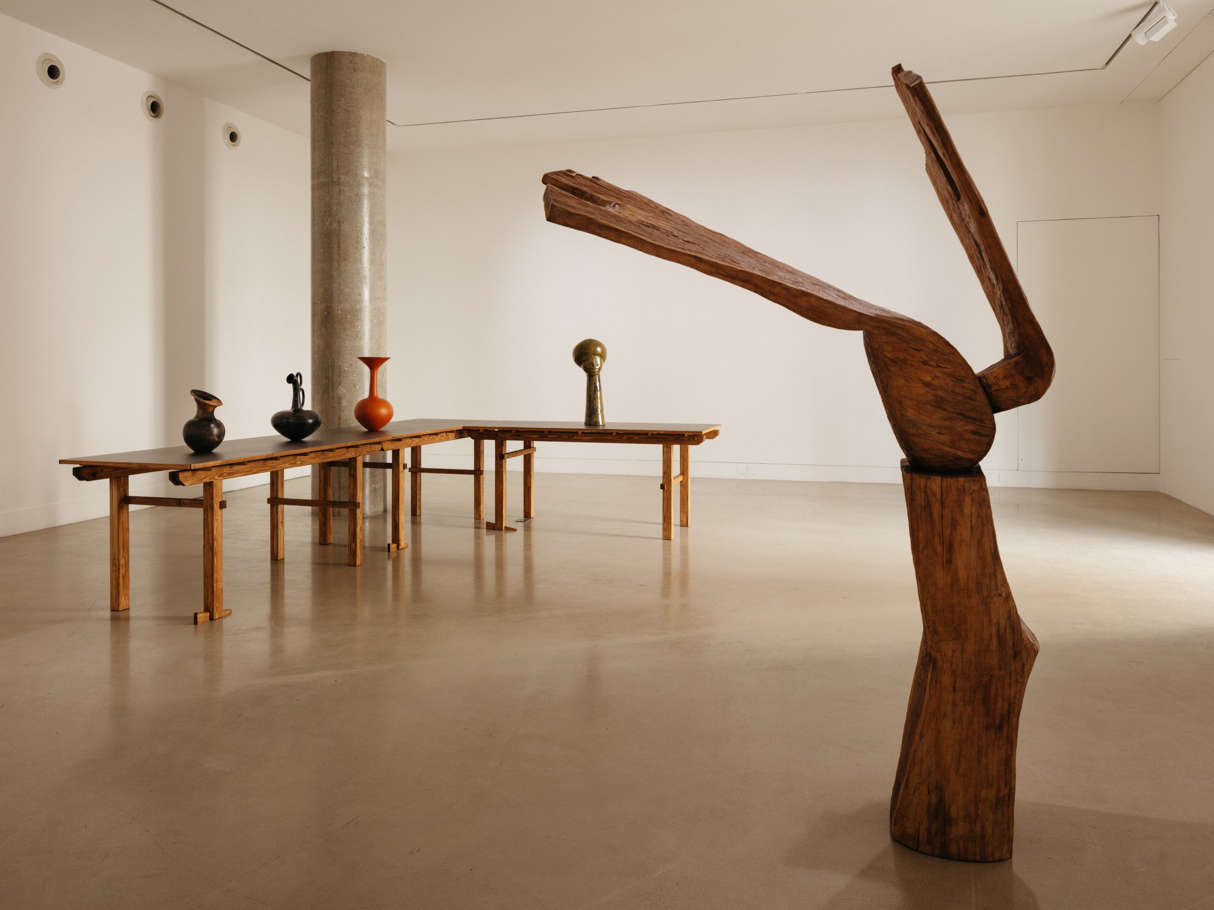 You walk into the room and find it has been transformed into something resembling more of an altar or sacred space than an art gallery. You are confronted immediately with an L-shaped wooden table, three Magdalene Odundo vessels spaced along one side, a Simone Leigh sculpture of a woman’s head and neck sitting on the short side. There is a quietness to the way they stand together, an intensity to how they occupy the space. It is as if you have entered a church or old library, something palpable in the air. Those objects hold within them a kind of spiritualism, a feeling of ancestral presence moving through and around them. Then you turn and find a large, wooden sculpture by Thaddeus Mosley standing isolated at a distance, its bird-like form reaching out towards the table. What is immediately obvious is the way these five works seem to speak to each other, conversing in secret signs and pulses in a way that onlookers would not understand.