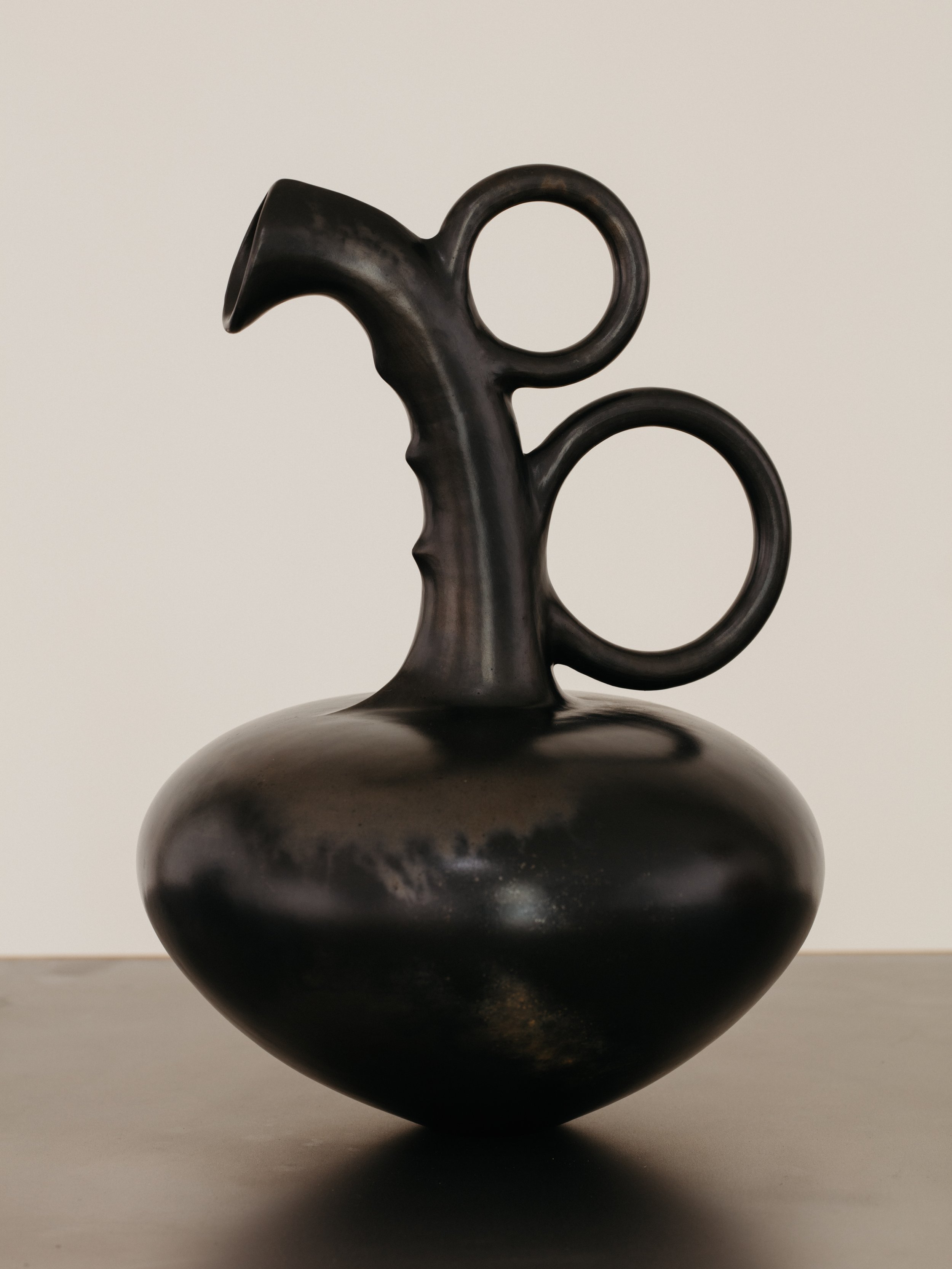 Unglazed, the pots were fired, often multiple times, at high temperatures in order to achieve the rich depth of colour that is so indicative of Odundo’s own work. It is present in the deep, cosmic black of Asymmetrical Reduced Black Piece, the silvery stardust brushed across its underbelly, or in the dual coloration of Untitled (1984), the bleed of terracotta orange across the dark surface—a kind of visual improvisation. It is the quality of shape and gesture in these vessels that makes them so appealing, as well as the ways they allude to storytelling. They encourage the viewer to think about the person who might carry them, the functionality they hold in everyday life.